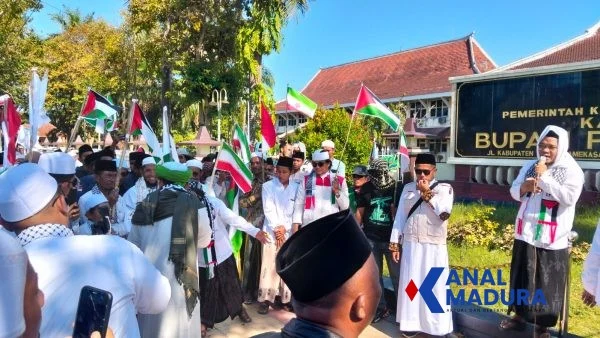 KANALMADURA.COM, PAMEKASAN – Gelombang solidaritas terhadap perjuangan kemerdekaan Palestina kembali menggema di Kabupaten Pamekasan. Ratusan masyarakat yang tergabung dalam komunitas Reng Bukalagen menggelar aksi damai dengan berjalan kaki (long march) dari Monumen Arek Lancor menuju Pendopo Ronggosukowati, Jumat (17/4/2026) sekitar pukul 14.00 WIB.