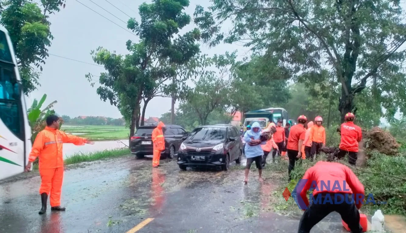 KANALMADURA.COM, SAMPANG – Hujan deras disertai angin kencang yang melanda sebagian wilayah Kabupaten Sampang pada Selasa (02/12/2025) siang mengakibatkan tiga pohon berukuran besar tumbang